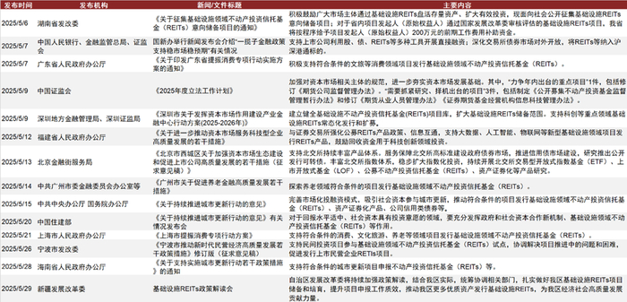 注:以上政策及文件依次来源于https://fgw.hunan.gov.cn/fgw/xxgk_70899/tzgg/202505/t20250506_33662944.html; http://www.scio.gov.cn/live/2025/35881/index.html; https://www.gd.gov.cn/xxts/content/post_4707147.html; http://www.csrc.gov.cn/csrc/c100028/c7556553/content.shtml; https://jr.sz.gov.cn/sjrb/xxgk/tzgg/content/post_12167363.html; https://www.fujian.gov.cn/zwgk/zxwj/szfbgtwj/202505/t20250512_6912634.htm; https://www.beijing.gov.cn/hudong/gfxwjzj/qjzjxx/202505/t20250513_4088118.html; https://jrjgj.gz.gov.cn/zcgh/content/post_10262439.html; https://www.gov.cn/zhengce/202505/content_7023882.htm; https://www.mohurd.gov.cn/xinwen/jsyw/art/2025/art_1cfb5540249447f1bb0a4f604be26649.html; https://www.shanghai.gov.cn/nw12344/20250521/8fe1297560be41b9b0395f6f2cd0b463.html; https://fgw.ningbo.gov.cn/art/2025/5/26/art_1229035899_64588.html; https://www.hainan.gov.cn/hainan/szfbgtwj/202505/2ea8102e41e948b6a521db7a5ea51cc7.shtml; https://mp.weixin.qq.com/s/RS5I5uJf9_7ffE-9eucwig。