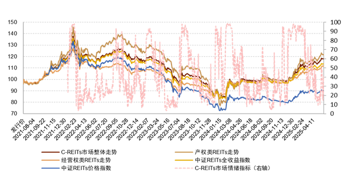 注:1)为了方便对比,我们对中证REITs价格指数及中证REITs全收益指数进行起始日期标准化调整;2)数据截至2025年5月30日;3)C-REITs市场情绪指标根据我们2023年3月24日发布的《公募REITs市场情绪初探》中描述的模型计算,并剔除了所有项目上市首日的换手数据