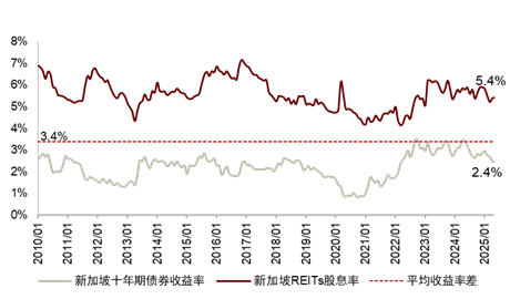 图表37:新加坡REITs股息率与新加坡政府十年期债券收益率对比