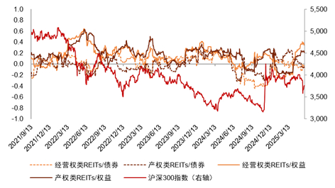 图表25:产权类及经营权类REITs与股债收益率60日滚动相关系数