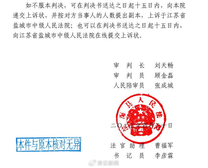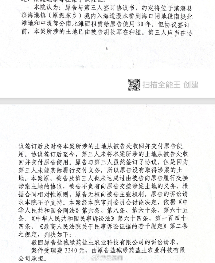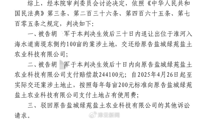 2024年1月,滨海法院对案件进行公开开庭审理。2025年4月30日,张春银得到胜诉判决。判决书显示,判决被告胡某军退让出100亩案涉土地,交还给绿苑公司,并支付相应赔偿款及土地占用使用费。