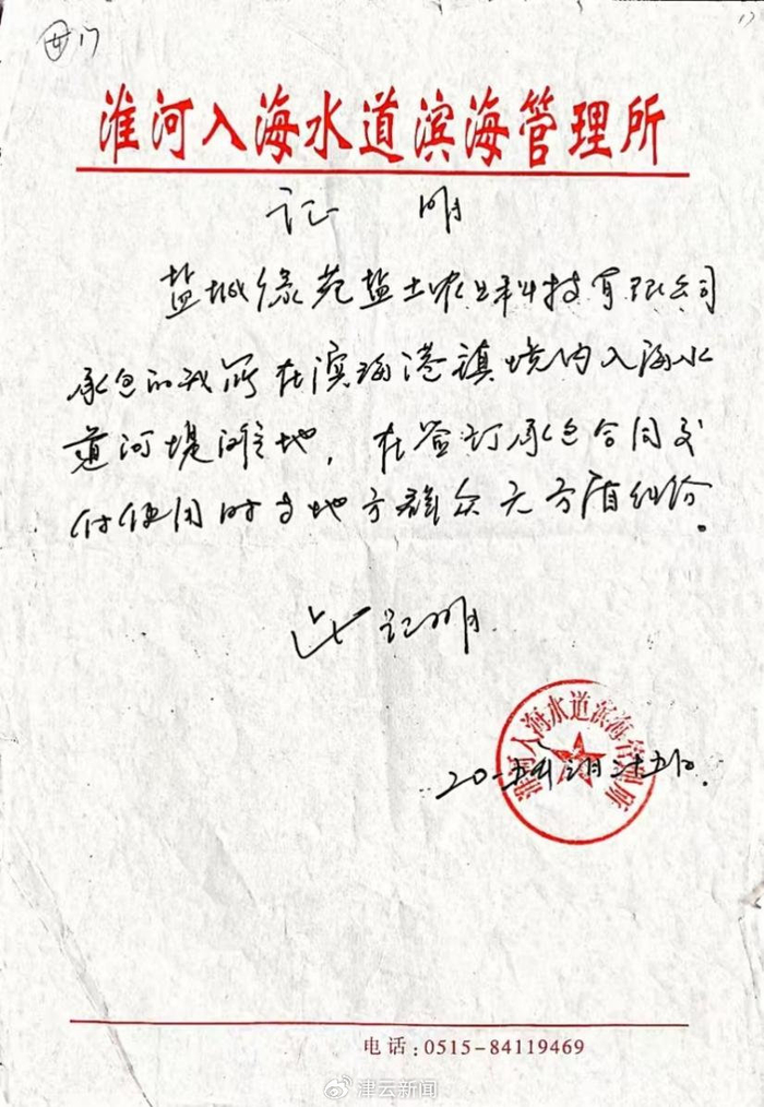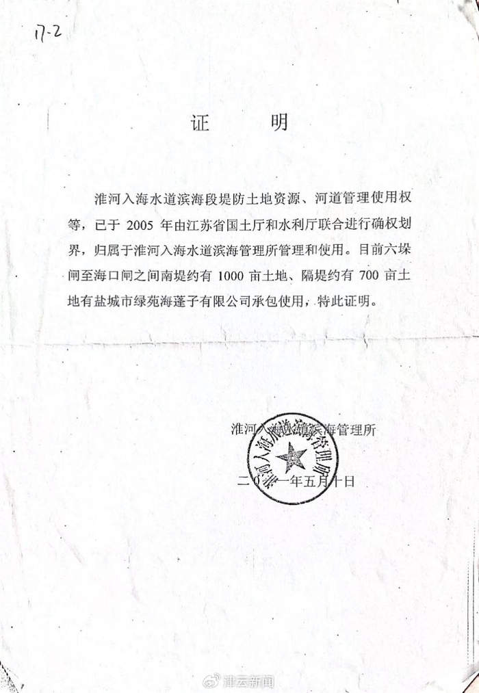 在此期间,土地出租方淮河入海水道滨海管理所多次出具《情况说明》中显示,“2005年江苏省国土厅和水利厅联合进行确权划界,并根据《江苏省淮河入海水道工程管理办法》之规定,淮河入海水道滨海段归属于我单位管理和使用,目前案涉1700亩地由绿苑公司承包使用,在签订承包合同交付使用时与地方群众无矛盾纠纷。”