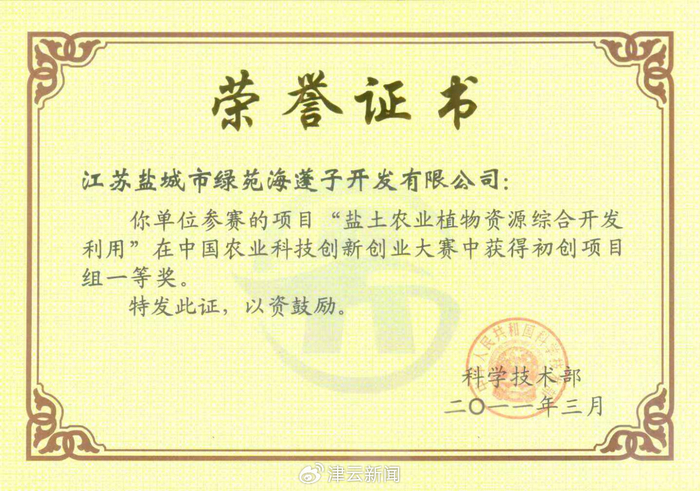 2009年,绿苑公司获得了耐盐碱“绿海碱蓬1号”和“绿苑海蓬子1号”两个新品种的自主知识产权。
