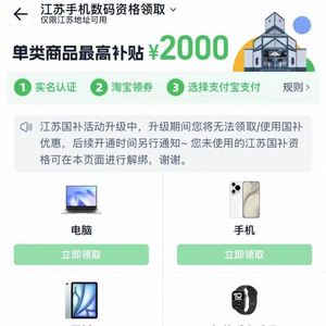 淘宝平台显示,江苏国补活动升级,期间无法领取国补优惠。