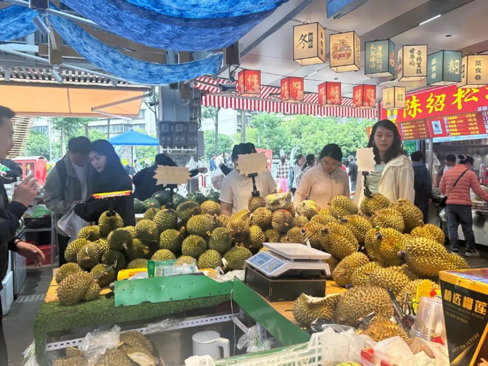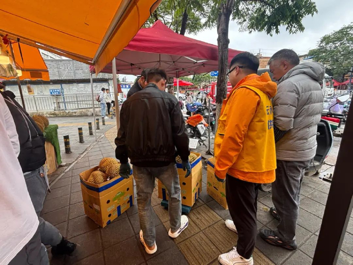 一位来自西安的女士正在马先生摊前挑选榴莲,她表示:“近期我们那边的榴莲每市斤在19—29元,感觉算下来跟昆明差不多,但由于运输时间长,运到那边的榴莲果型和品质都没有昆明的好,而且有的品种是没有的。”