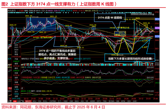下方3174点一线是多重前期低点、前期高点汇聚而成的平衡线支撑位,支撑有力。指数下方2024年5月形成的前期高点3174点是W底颈线位支撑位,同时是多重前期低点支撑,也是60周均线、120周均线及90周均线等长期周均线支撑位附近。“关税战”的利空影响下,指数曾一度跌破3174点支撑,但快速收回,抵抗住较大的利空影响,在此一线支撑较为有力。