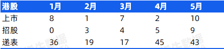 5月,港交所有10家新股上市,9家新股招股,43家递表。港交所IPO申请数维持在高位,1~4月港交所IPO申请数分别为36、19、17、45家,愈来愈多的企业选择赴港上市。