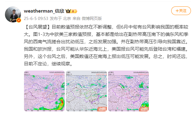 目前数值预报依然在不断调整,但6月中旬有台风影响我国的概率较大。中欧美三家数值预报,基本都是给出在副热带高压南下的偏东风和季风的西南气流搓合出扰动低压,之后发展加强,并在副热带高压引导向我国靠近。我国和欧洲报,台风可能从华东近海北上,美国报台风可能先后登陆台湾和福建。另外,这个台风之后,美国数值还在南海上报出低压可能发展。