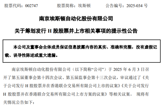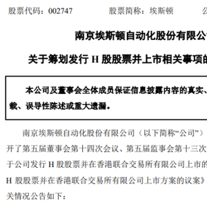 6月4日晚间,中国工业机器人龙头南京埃斯顿自动化股份有限公司(简称“埃斯顿”,002747.SZ)公告,为深化全球化战略布局,加快海外业务发展,提升公司国际化品牌形象,进一步提升公司核心竞争力,公司拟发行境外上市外资股(H股)股票并在香港联合交易所有限公司主板挂牌上市。