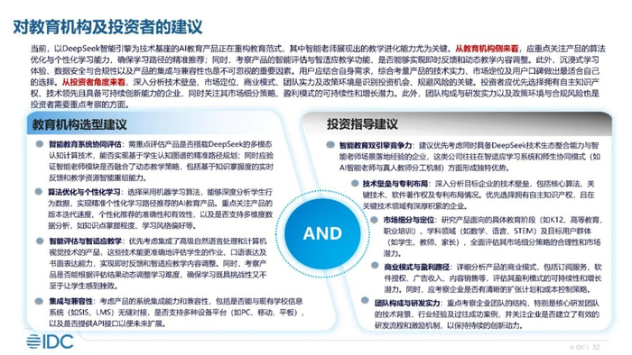 对于有意布局AI智能教育赛道的教育机构而言,需重点关注产品算法优化与个性化学习能力提升。深入审视智能评估体系、智适应教学功能的精准度与有效性,强化即时反馈与动态教学内容调整机制,以适应教育市场对智能化教育产品与服务的高标准要求。