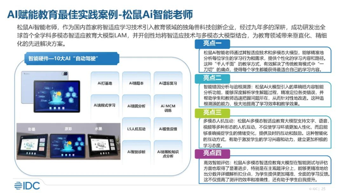2025年3月,IDC(国际数据公司)发布了《AI智适应变革教育行业:契机与趋势》报告,通过深入研究AI在教育领域的现状趋势、应用场景、案例实践及行业启示四大方面,展示了AI颠覆传统教育模式,赋能教育领域的无限潜力,并为教育从业者、投资者及关注教育领域发展的社会各界提供了详实的参考依据。
