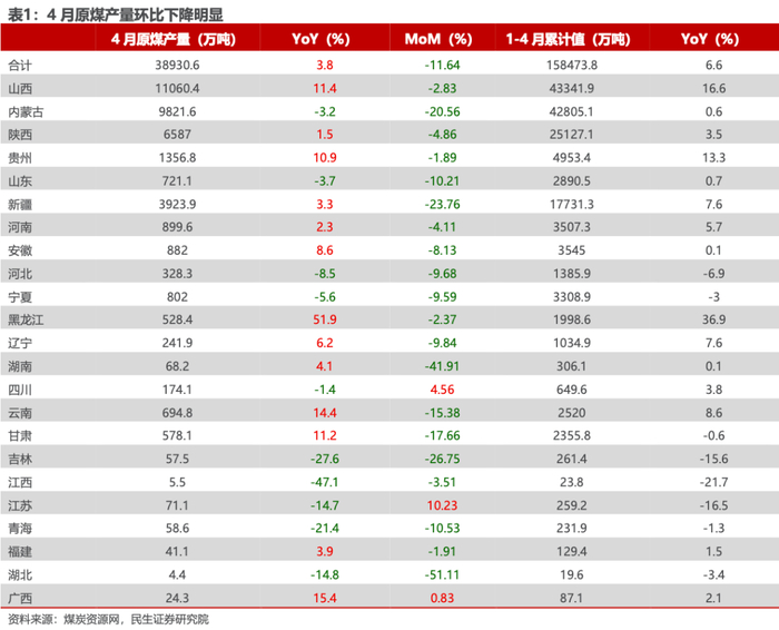 低煤价下,供给快速收缩,库存去化助力价格上涨。从4月产量数据来看,全国原煤产量环比下降11.64%,主要由于新疆、内蒙古等边际产量的退出,截至4月末,行业亏损面已达到50%以上,考虑5月价格持续下降,预计供给端仍将继续收缩。进口方面价差仍不具备优势,进口量有望持续缩减。从库存端来看,5月传统淡季环渤海港口库存下滑,电厂库存同比降低,有望助力煤价上涨。