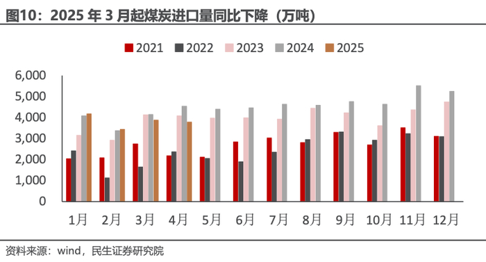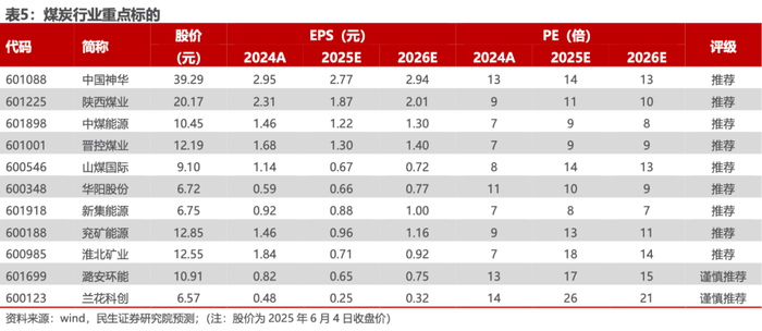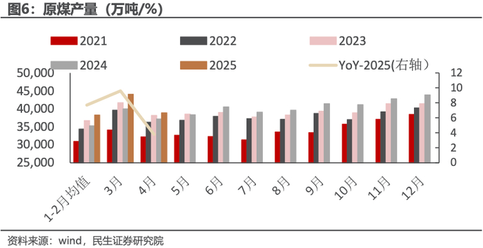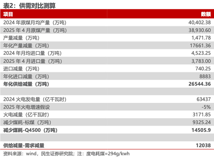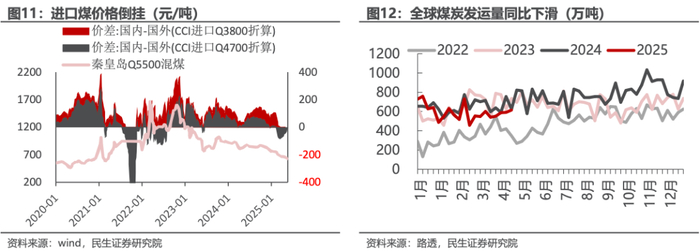 供给收缩幅度大于需求,煤价超跌。我们以2024年的月均产量、进口量为基数,2025年4月产量、进口量分别下降1472万吨、740万吨,年化供给端的收缩量为2.65亿吨,而假设2025年火电发电量减少5%(2025年1-4月累计下降4.1%),对应煤炭消耗量减少1.45亿吨(Q4500),对比发现供给端的收缩远大于需求端,因此我们判断煤价处于超跌状态。