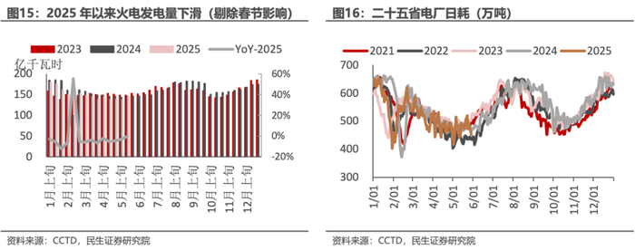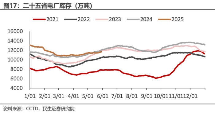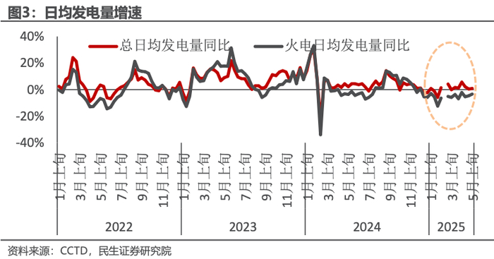电力需求季节性反弹即将开启。2025年以来,社会发电量增速放缓,1-4月累计发电量增速仅为0.1%,其中火电发电量增速为-4.1%,整体电力需求较弱。5月中旬,社会日均发电量为233.20亿千瓦时,同比增速+3.32%,为年内首次正增长(剔除春节影响),火电日均发电量145.80亿千瓦时,同比增速-0.27%,火电降幅收敛,随着夏季用电高峰的到来,火电发电量转正在即。