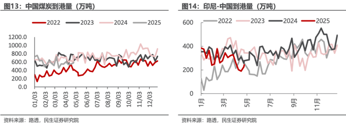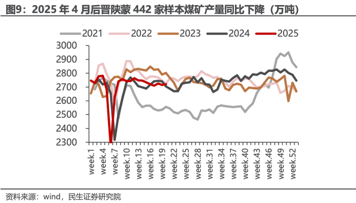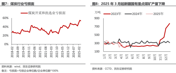 煤炭企业亏损面扩大,未来国内煤企被动/主动减产概率正逐步加大。截至2025年4月,煤炭行业亏损企业占比过半,达到53.64%,为2018年以来的最高水平。以新疆国有重点煤矿产量来看,2023Q4增产保供时期,产量最高达到2145万吨/月,2024年产量高点在979万吨/月,2025年4月产量为718万吨/月,较2023年最高点下降1427万吨/月,较2024年水平下降260万吨/月,我们认为主要是价格压力下疆煤外运利润下滑,露天矿为主的低价煤利润空间压缩所致。从晋陕蒙442家样本煤炭企业产量数据来看,2025年产量略低于去年同期水平。如果后续煤价持续低迷,我们可以预期国内煤炭企业被动、主动减产的概率会逐步上升。