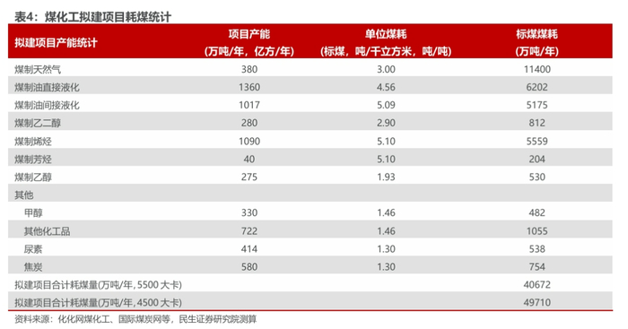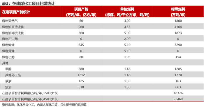 在建+潜在煤化工项目丰富,未来化工行业耗煤将持续提升。我们梳理了目前在建和拟建的新型煤化工项目,主要包含煤制油、煤制气、煤制烯烃等(相关产能如下表),考虑到以新疆为主的增量煤炭供应平均热值为4500千卡,因此,预计在建煤化工项目的潜在需求量为2.25亿吨,另外拟建项目的潜在需求量为4.97亿吨,因此预计未来煤化工的潜在需求量有望达到7.21亿吨,以我们测算现有在产化工项目耗煤量6.39亿吨为基数,未来化工行业耗煤实现近翻倍的增长(折算Q5500在建+拟建合计需求量5.90亿吨)。