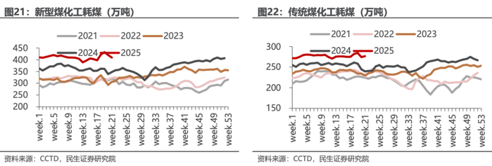 化工行业耗煤保持高增速。近三年以来,化工行业耗煤持续保持较高增速,截至2025年5月23日当周,化工行业总耗煤量达到1.44亿吨,同比增长11.13%,其中以煤制油、煤制烯烃等为代表的新型煤化工耗煤量为8621.11万吨,同比增长13.15%;以煤制甲醇、合成氨等为代表的传统煤化工耗煤量为5817.9万吨,同比增长8.27%;新型煤化工贡献了大部分耗煤增量。