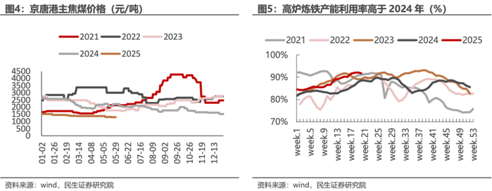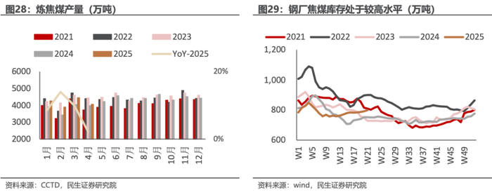 焦煤价格压力仍存。2025年以来焦煤价格持续下跌,主要由于供给端压力较大。需求端高炉炼铁产能利用率高于2024年,焦煤的库存压力集中在煤矿,需要达到新的供需平衡后才能看到反转迹象。