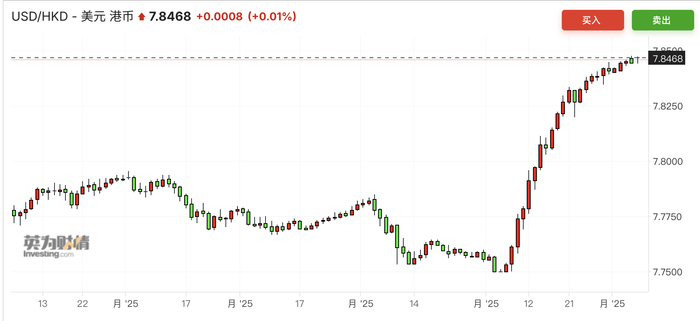 具体而言,当前3个月HIBOR下跌,提升了美元/港元现汇与远期交易的套息收益,做多美元/港元远期合约的年化套息收益创新高,短期外汇远期(如1个月)提供的套息回报远高于12个月远期(年化收益超4%)。由于正套息空间大、汇率风险有限(最多1.2%的下行空间,假设联系汇率区间不变),吸引投资者做多美元/港元现汇。如果汇价触及弱方7.85,香港金管局可能收紧港元流动性,推高HIBOR。