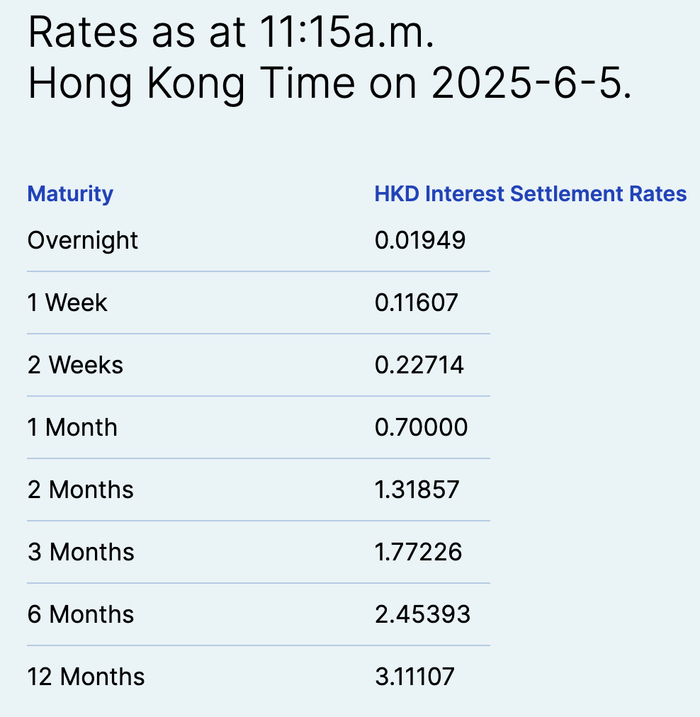 截至6月5日,1个月香港银行同业拆借利率(HIBOR)快速下行至0.7%附近,相较月初接近0.9%的水平进一步下行。而在4月末,这一数值还高达4%。隔夜HIBOR利率更是已趋近于0(0.01949%),接近历史最低水平。