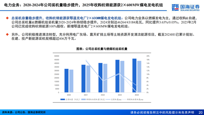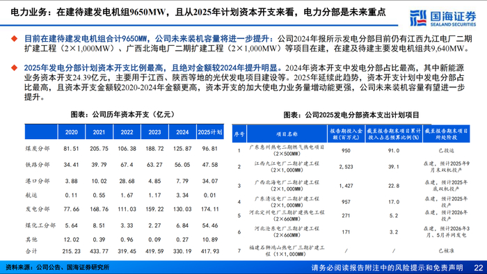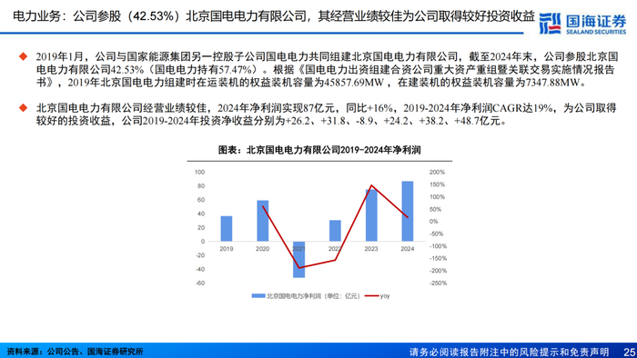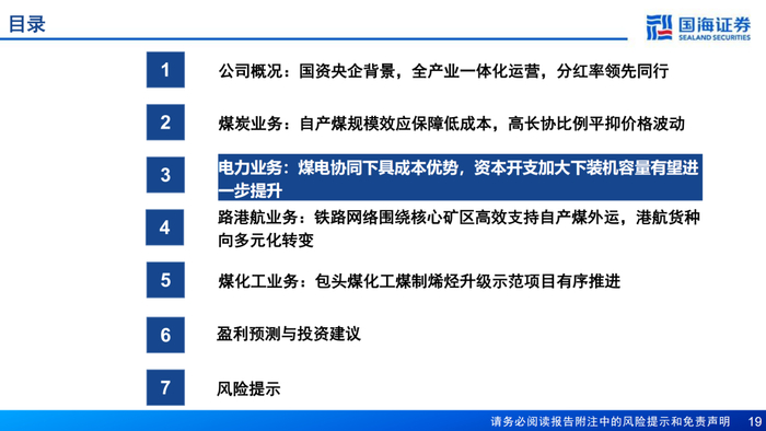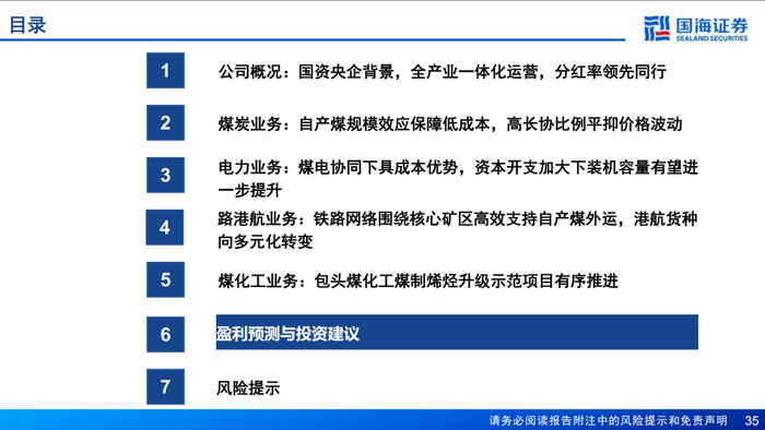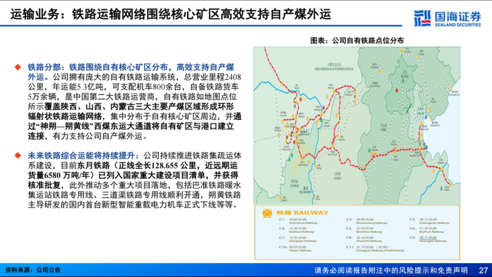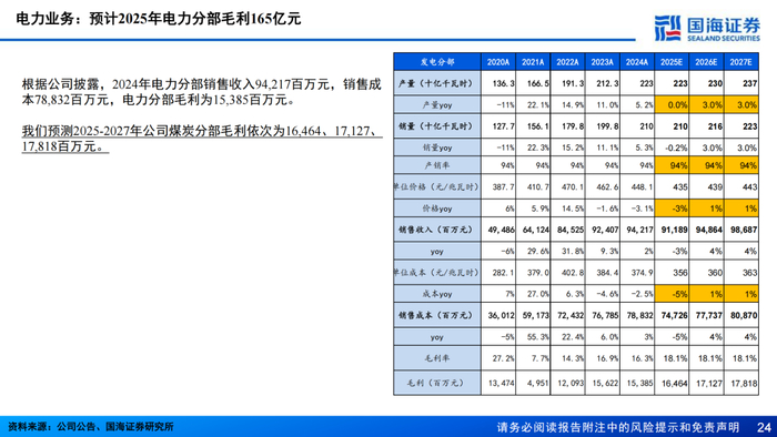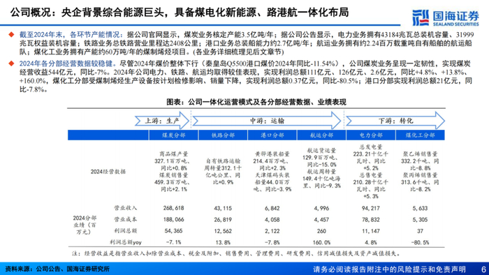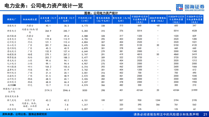 电力业务:拥有在建及待建发电机组9640MW,未来煤炭自给率提升将进一步优化电力成本。2024年公司总装机量为46264MW,同比提升3.65%。2025年2月,公司通过收购杭锦能源,新增鄂温克电厂2X600MW煤电发电机组。未来装机量有望延续增势,截至2024年末在建及待建主要发电机组共9640MW。从经营数据看,装机容量增长带动公司发售电量增长,公司2024年发电量同比提升5.2%至223.21十亿千瓦时,同比增速高于全国规模以上火电厂发电量同比增速(+1.5%)。2024年公司销售电价与单位成本均下降,分别为448元/兆瓦时和375元/兆瓦时,单位毛利73元/兆瓦时。目前公司电力分部煤炭自给率76%,未来随煤炭资产注入,自给率有望提升,将进一步强化电力成本优势。我们预计2025年电力分部毛利165亿元。同时,公司参股(42.53%)北京国电电力有限公司,其2024年净利润87亿元,2019-2024年净利润CAGR达19%,为公司提供较好投资收益。