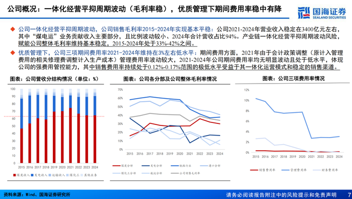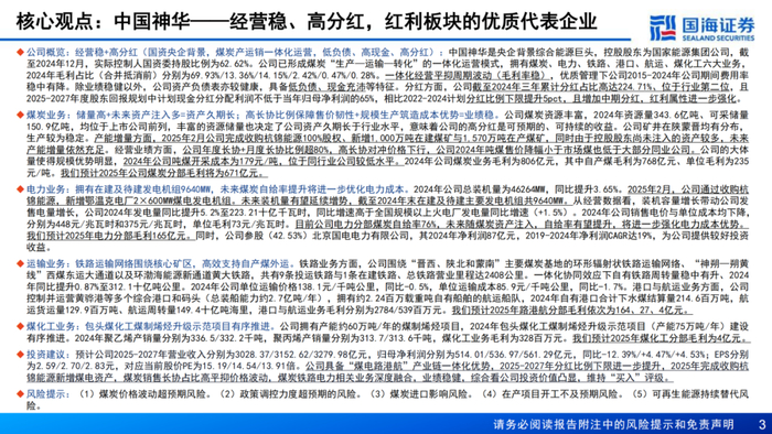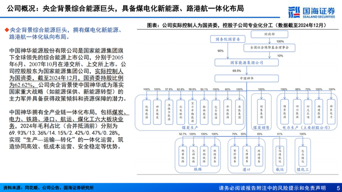 公司概览:经营稳+高分红(国资央企背景,煤炭产运销一体化运营,低负债、高现金、高分红)。中国神华是央企背景综合能源巨头,控股股东为国家能源集团公司,截至2024年12月,实际控制人国资委持股比例为62.62%。公司已形成煤炭“生产一运输一转化”的一体化运营模式,拥有煤炭、电力、铁路、港口、航运、煤化工六大业务,2024年毛利占比(合并抵消前)分别为69.93%/13.36%/14.15% /2.42%/0.47%/0.28%。一体化经营平抑周期波动(毛利率稳),优质管理下公司2015-2024年公司期间费用率稳中有降。除业绩稳健以外,公司资产负债表亦较健康,具备低负债、现金充沛等特征。分红方面,公司截至2024年三年累计分红占比高达224.71%、位于行业第二位,且2025-2027年度股东回报规划中计划现金分红分配利润不低于当年归母净利润的65%,相比2022-2024计划分红比例下限提升5pct,且增加中期分红,红利属性进一步强化。