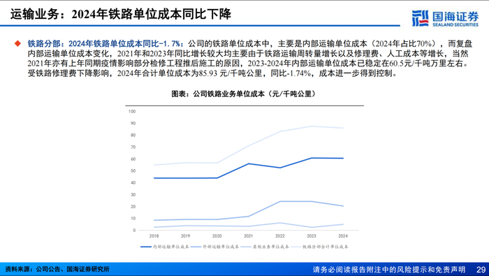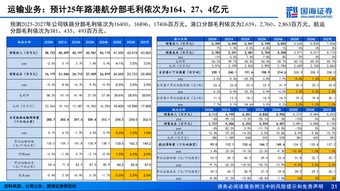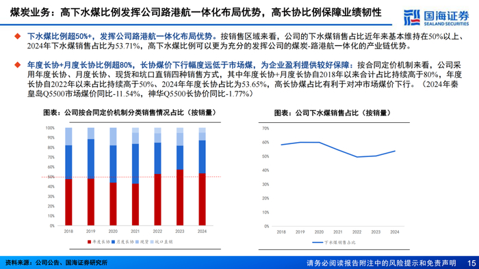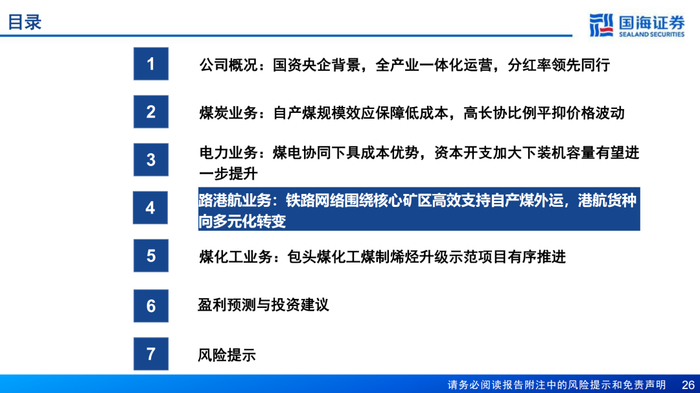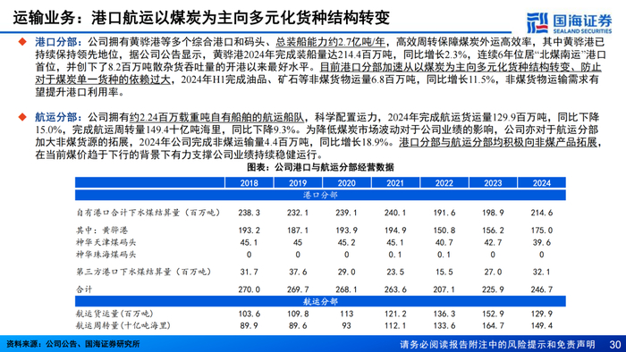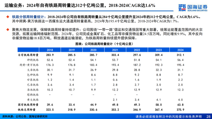运输业务:铁路运输网络围绕核心矿区,高效支持自产煤外运。铁路业务方面,公司围绕“晋西、陕北和蒙南”主要煤炭基地的环形辐射状铁路运输网络、“神朔一朔黄线”西煤东运大通道以及环渤海能源新通道黄大铁路,共有9条投运铁路与1条在建铁路、总铁路营业里程达2408公里。一体化协同效应下自有铁路周转量稳中有升、2024年同比提升0.87%至312.1十亿吨公里。2024年公司单位运输价格138.1元/千吨公里,同比-0.5%,单位运输成本85.9元/千吨公里,同比-1.7%。港口与航运业务方面,公司控制并运营黄骅港等多个综合港口和码头(总装船能力约2.7亿吨/年),拥有约2.24百万载重吨自有船舶的航运船队,2024年自有港口合计下水煤结算量214.6百万吨,航运货运量129.9百万吨、航运周转量149.4十亿吨海里,港口与航运业务毛利分别为2784/539百万元。我们预计2025年路港航分部毛利依次为164、27、4亿元。