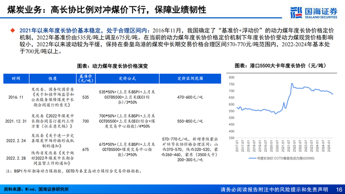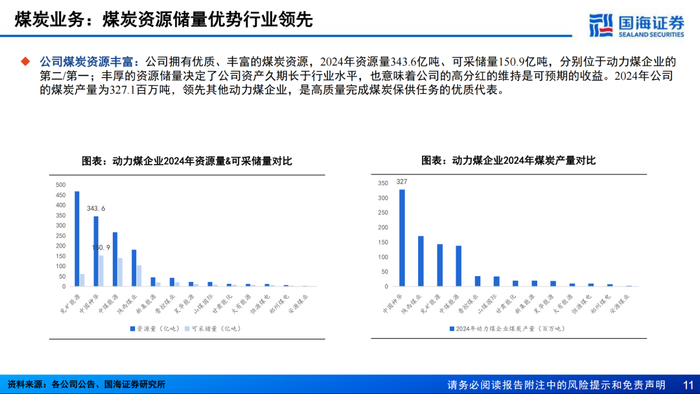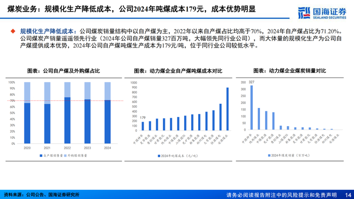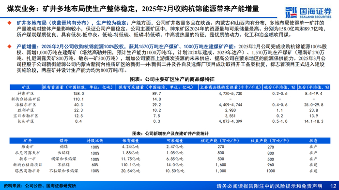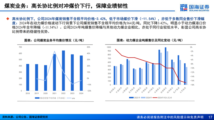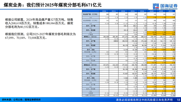 煤炭业务:储量高+未来资产注入多=资产久期长; 高长协比例保障售价韧性+规模生产筑造成本优势=业绩稳。公司煤炭资源丰富,2024年资源量343.6亿吨、可采储量150.9亿吨,均位于上市公司前列,丰富的资源储量也决定了公司资产久期长于行业水平,意味着公司的高分红是可预期的、可持续的收益。公司矿井在陕蒙晋均有分布,生产较为稳定。产能增量方面,2025年2月公司完成收购杭锦能源100%股权、新增1,000万吨在建煤矿与1.570万吨在产煤矿,同时由于控股股东尚未注入的资产较多,未来产能增量依然充足。经营业绩方面,公司年度长协+月度长协比例超80%,高长协对冲价格下行,公司2024年吨煤售价降幅小于市场煤也低于大部分同业公司。公司的大体量使得规模优势明显,2024年公司吨煤开采成本为179元/吨,位于同行业公司较低水平。2024年公司煤炭业务毛利为806亿元,其中自产煤毛利为768亿元、单位毛利为235元/吨。我们预计2025年公司煤炭分部毛利将为671亿元。
