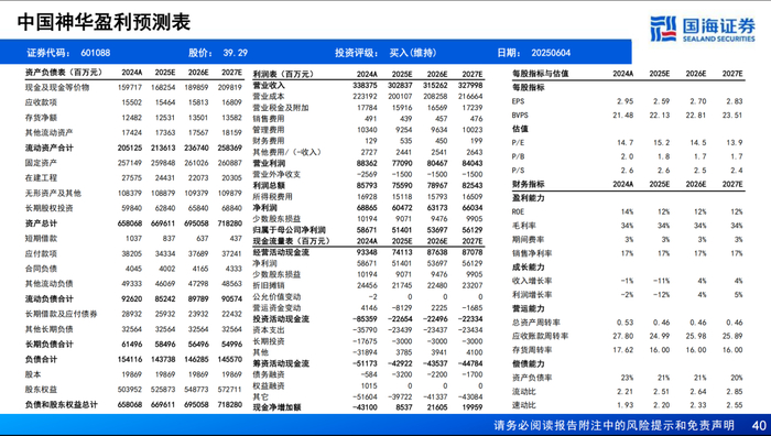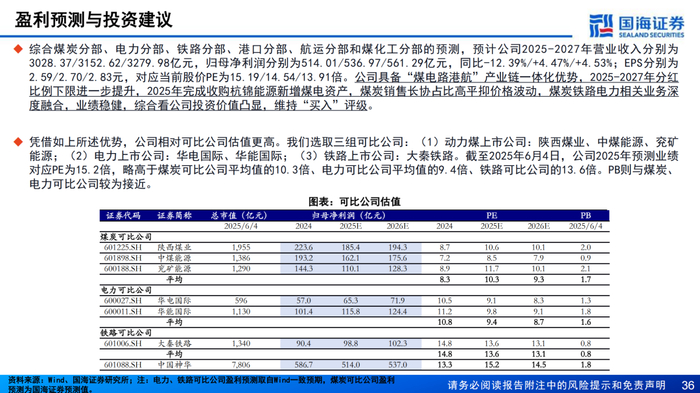 投资建议:预计公司2025-2027年营业收入分别为3028.37/3152.62/3279.98亿元,归母净利润分别为514.01/536.97/561.29亿元,同比-12.39%/+4.47%/ +4.53%;EPS分别为2.59/2.70/2.83元,对应当前股价PE为15.19/14.54/13.91倍。公司具备“煤电路港航”产业链一体化优势,2025-2027年分红比例下限进一步提升,2025年完成收购杭锦能源新增煤电资产,煤炭销售长协占比高平抑价格波动,煤炭铁路电力相关业务深度融合,业绩稳健,综合看公司投资价值凸显,维持“买入”评级。