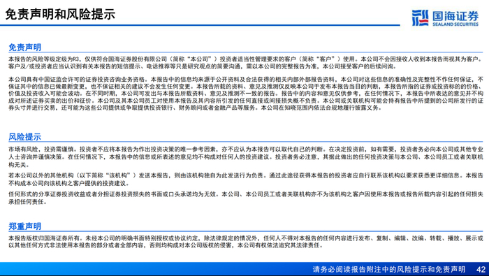 本报告的风险等级定级为R3,仅供符合国海证券股份有限公司(简称“本公司”)投资者适当性管理要求的客户(简称“客户”)使用。本公司不会因接收人收到本报告而视其为客户。客户及/或投资者应当认识到有关本报告的短信提示、电话推荐等只是研究观点的简要沟通,需以本公司的完整报告为准,本公司接受客户的后续问询。