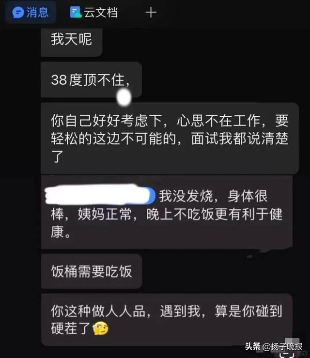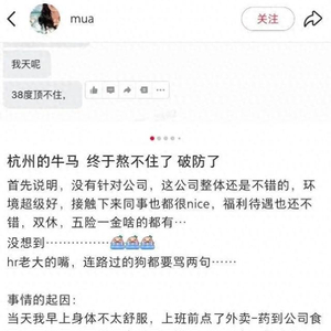 6月5日上午,天眼查社交账号发布一则网贴称,有网友发文吐槽某公司HR称,其发烧37.9度向HR负责人请假1小时,结果却遭到对方辱骂。网帖显示,HR对其发表“你这也太娇气了,我天呢,38度顶不住”“该看看精神科了”等言论。