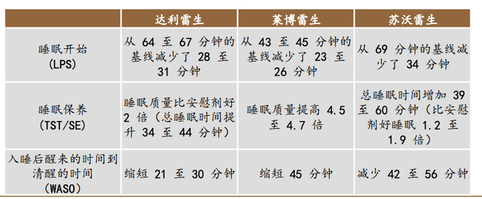 地达西尼在治疗成人原发性失眠症上表现良好。对于成人患者,相比于安慰剂,1.5 mg和2.5 mg的地达西尼分别延长总睡眠时长33.1和45分钟,减少入睡后的觉醒16.7和25.7分钟,减少觉醒次数1.2和2.6次,两种剂量均显著改善了患者的睡眠质量。此外,地达西尼治疗老年原发性失眠症也表现良好,且能显著降低老年患者日间生理性睡眠倾向。
