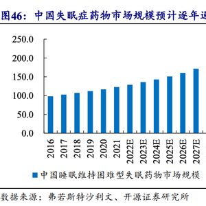 弗若斯特沙利文数据显示,在国内,2016年至2020年失眠症成人患病人数从2.5亿增至2.7亿,预计2024年达3.0亿、2030年增至3.3亿。同期失眠症药物市场规模从98.4亿元增至117.0亿元,预计2025年、2030年分别达151.2亿元、211.9亿元。德邦证券指出,2022年我国失眠化药市场规模42亿元,同比增长18.9%,其中苯二氮卓类药物销售额14.8亿元(占比最高),市场增长潜力显著。