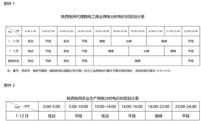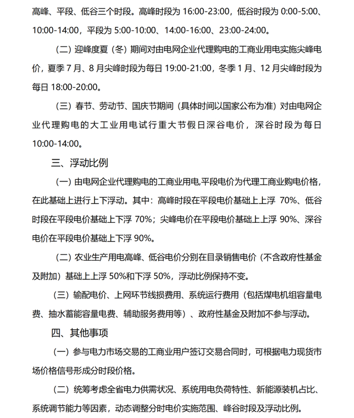 3、春节、劳动节、国庆节期间(具体时间以国家公布为准)对由电网企业代理购电的大工业用电试行重大节假日深谷电价,深谷时段为每日10:00-14:00。