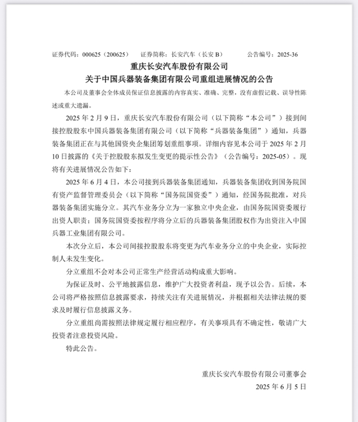 6月5日清晨,长安汽车、东安动力、湖南天雁等多家上市公司同步发布公告,披露了中国兵器装备集团的分立重组方案。