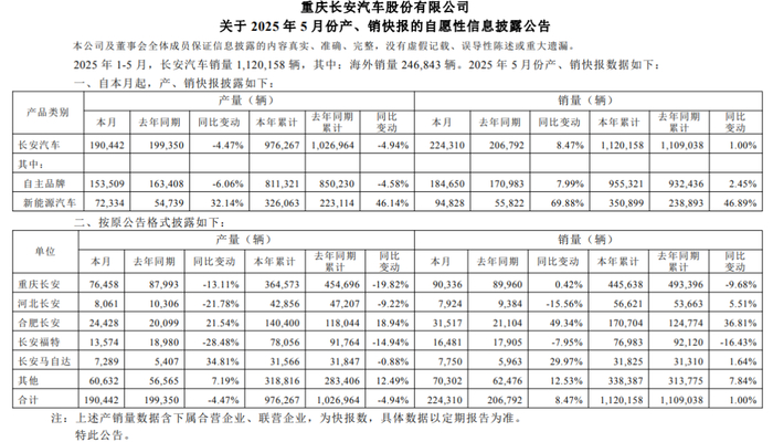 最新披露的产销快报显示,2025年前5月,长安汽车累计销量112.0万辆,完成目标的37%;新能源销量35.1万辆,同比增长46.89%,完成新能源目标的35%。