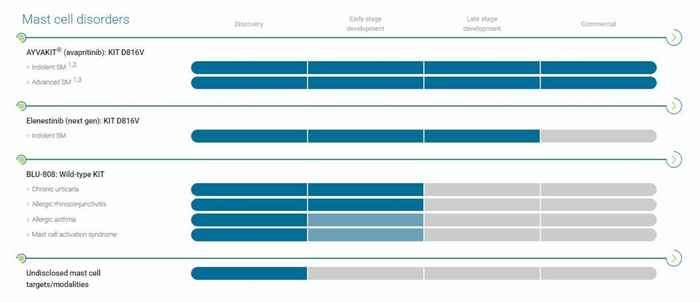 系统性肥大细胞增多症(SM)是一种罕见免疫疾病,为此Blueprint还打造了治疗SM的下一代药物Elenestinib。作为一种下一代、强效、高选择性KIT D816V抑制剂,Elenestinib具有有限的中枢神经系统渗透性,目前正在开展联合症状导向疗法治疗ISM和熏染性SM患者的II/III期研究。