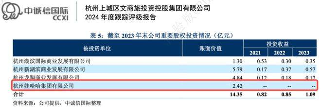 根据中诚信国际的一份2024年度跟踪评级报告显示,作为娃哈哈的第一大股东,杭州上城区国资持股46%,2021年-2023年对娃哈哈集团的投资收益为0,账面价值仅有2.42亿元。