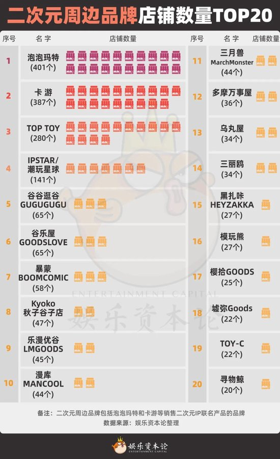 娱乐资本论综合店铺数量、覆盖城市、商圈和消费水平等各项数据,整理了一份二次元周边品牌梯队。