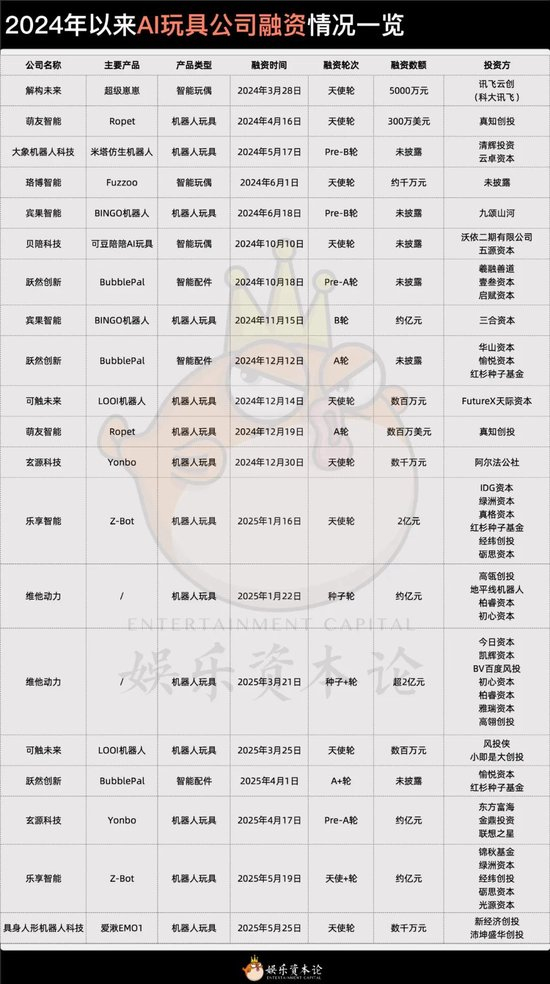 把时间轴进一步拉长,2024年以来已经有12家涉及AI玩具业务的公司拿到融资。Haivivi跃然创新甚至在这一年半的时间里就拿到了三轮融资。两相对比之下,二次元周边市场虽然热度不减,但资本还是给出了他们的选择。