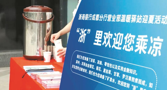 浙商银行成都分行各营业网点设置了夏日清凉驿站,不仅准备了风油精、花露水、冰饮、充电器、急救药品等,还向家长群体提供休息区域并赠饮凉茶。