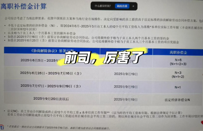 2025年6月25日前签约,支付N+6【N+1+2+3】作为离职补偿金,N为过去12个月月平均收入乘以花旗服务年限,月平均收入和服务年限均无封顶,加6部分基数为2025年5月基本工资。