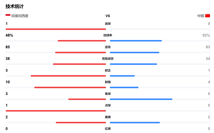 开场后,印尼队凭借主场优势持续给国足施压。整个上半场,除了王钰栋有一次得分机会外,国足的进攻组织得并不算好,甚至射正次数为零。反倒是印尼队凭借点球机会,打进一球,锁定胜局。当时是第42分钟,杨泽翔在禁区内与对方球员坎布瓦亚发生接触,后者倒地。在经过VAR介入后,主裁判判给印尼队一个点球。罗梅尼点射命中。
