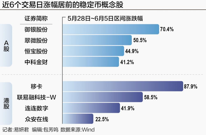 5月28日—6月5日期间,御银股份走出五连板,翠微股份、中科金财、恒宝股份等数字货币、区块链概念股频频涨停。同时,港股相关个股也出现异动。