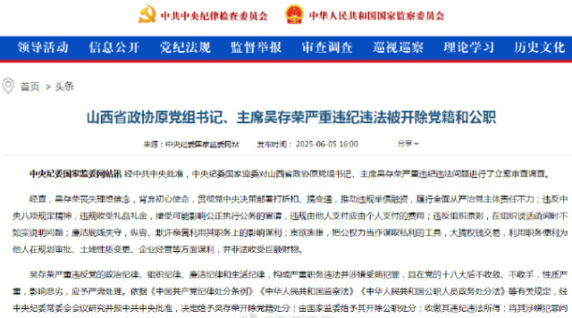1、吴存荣被开除党籍和公职 中央纪委国家监委5日公布对山西省政协原主席吴存荣审查调查结果。经查吴存荣严重违反党的政治纪律、组织纪律、廉洁纪律和生活纪律,构成严重职务违法并涉嫌受贿犯罪,决定开除其党籍和公职,涉嫌犯罪问题移送检察机关依法审查起诉。(中央纪委国家监委网站)