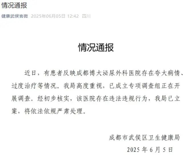2、成都博大泌尿外科医院被调查 5日,成都市武侯区卫生健康局发布通报称,近日,有患者反映成都博大泌尿外科医院存在夸大病情、过度治疗等情况。武侯区卫生健康局已成立专项调查组正在开展调查。经初步核实,该医院存在违法违规行为,已立案,将依法依规严肃处理。(@央视新闻)