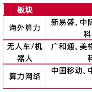 建议关注:海外算力:新易盛、中际旭创、剑桥科技、源杰科技、仕佳光子、腾景科技、沃尔核材、鼎通科技、胜宏科技。无人车/机器人:广和通、美格智能、华工科技、天准科技、中科创达、创耀科技、裕太微、速腾聚创、禾赛科技。算力网络:中国移动、中国电信、盛科通信、长飞光纤、博创科技、德科立、光迅科技。