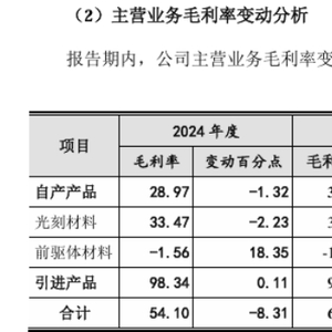 报告期内,公司毛利率分别为72.60%、62.24%和53.84%,主营业务毛利率分别为72.74%、62.41%和54.10%,详细来看,自产产品毛利率分别为33.52%、30.29%和28.97%,光刻材料毛利率分别为39.17%、35.70%和33.47%;前驱体毛利率分别为-329.59%、-19.91%和-1.56%。