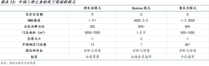 第一种模式是永辉重点学习的胖东来模式,门店面积3000-7000平方米,无需会员费,SKU数量在几个模式中最高,达到1万以上,商品均为小包装,自有产品销售占比达到30%,目前胖东来在中国总开店数为13家,分布在新乡和许昌两个下线城市。