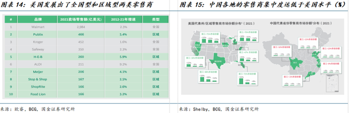 随着新型零售巨头的发展,中国有望改变过去低集中度的零售格局,这也是零售龙头能够在后消费时代依靠内需长期增长的动力来源。对比中美两国,美国多个州零售商CR3份额合计至少超过35%,在部分州可以达到70%+的水平,而中国各省份零售商CR3份额只有10%左右,这是同质化过高的传统商超模式导致的必然结果。未来新型零售巨头有望通过差异化的买断式商业模式,实现集中度的持续提升。